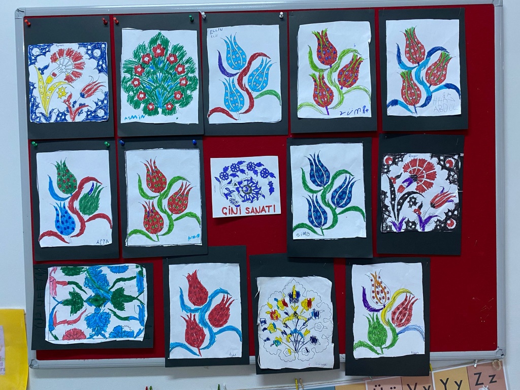 Anasınıfı D şubesi; Dilimizin Zenginlikleri projesi kapsamında şubat ayı konusu olan kültürel ögelerimizden “Çini” sanatını öğrendik. Seçtikleri çini motiflerini küçük çini ustaları diledikleri gibi boyadı.
