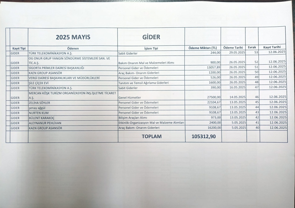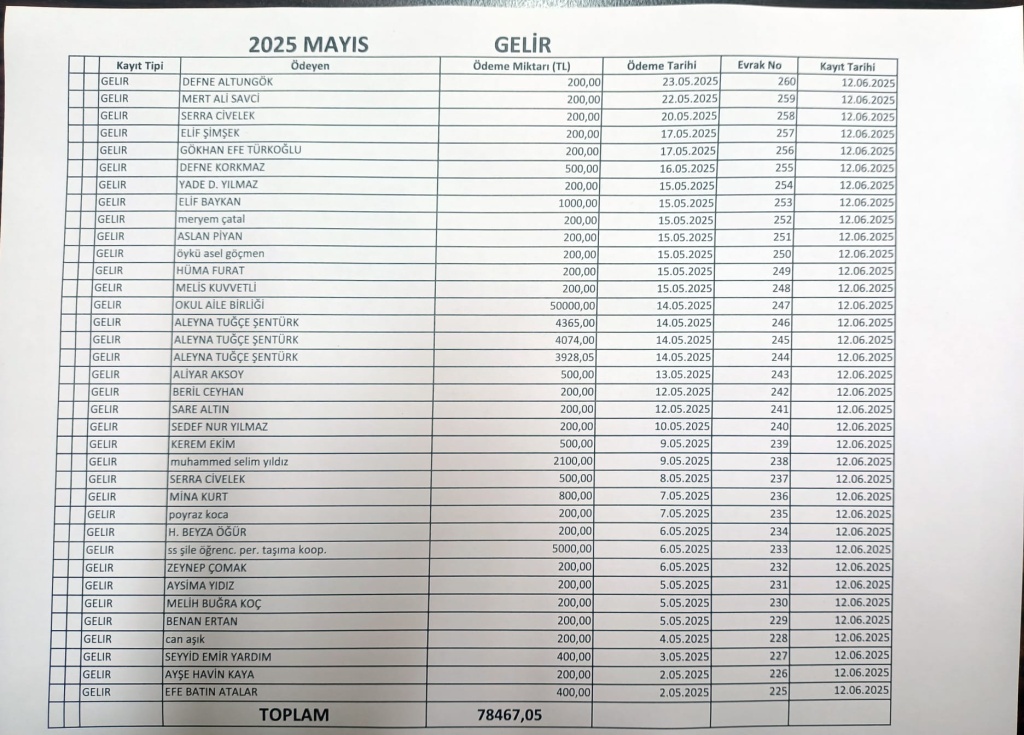 OKUL AİLE BİRLİĞİ MAYIS 2025 GELİR VE GİDER TABLOLARIMIZ